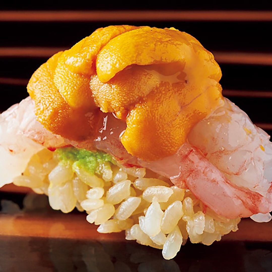 甘エビにうにをどっさりのせた「えびうに」など、“りんだ”で修業を積んだ若き大将がユーモアに富んだ握りを振る舞う。