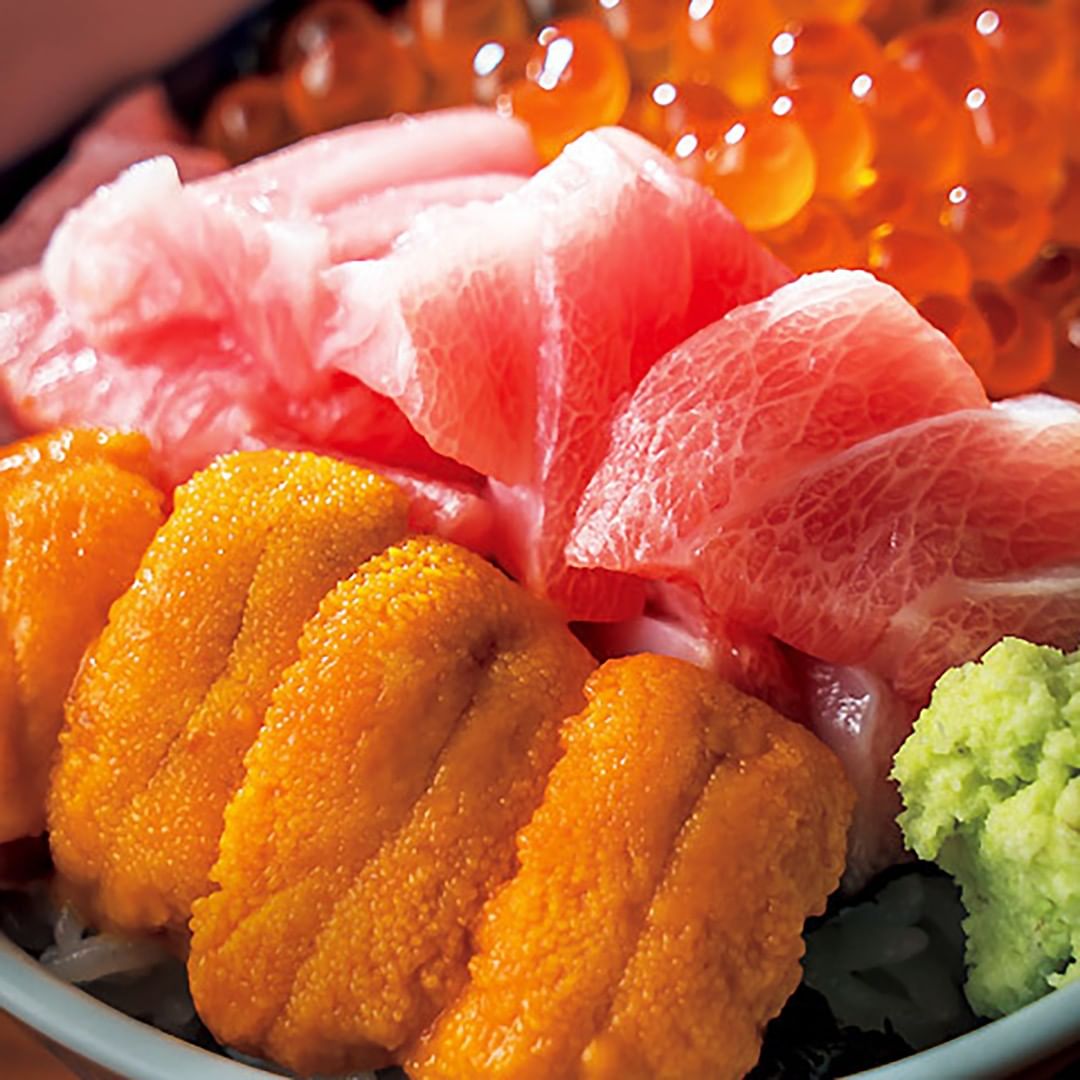 80品以上のメニューで必食なのが、まぐろ、うに、いくらをこれでもかとのせた「ぜいたく丼」だ。