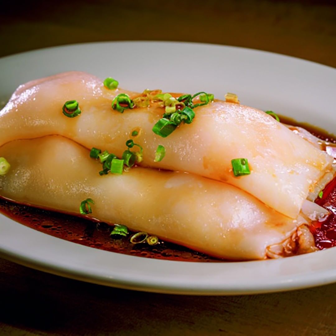 専用の器具に粉を流し込んで蒸し、ミルフィーユ状に海老を包み込む。出来立ての腸粉は喉ごしがなめらか。