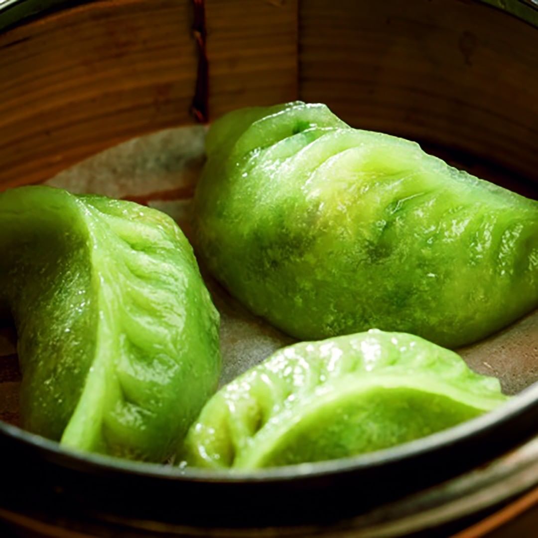 自家製の皮に青汁の粉を練り込み、香り高い春菊の餡を包んだ餃子。自家農園の新鮮な無農薬野菜を使用
