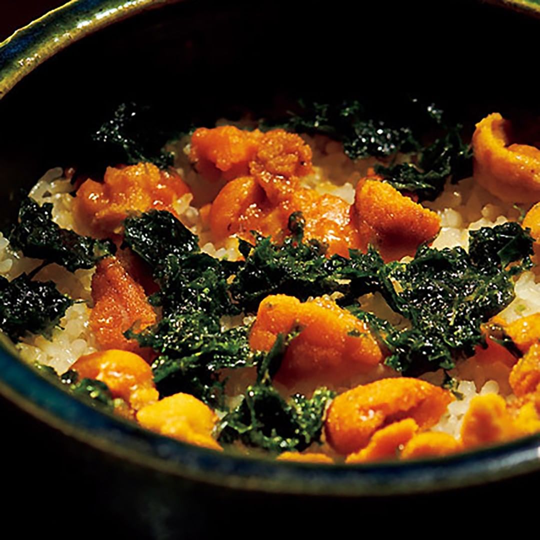 写真の「雲丹ご飯」など土鍋の炊き込みご飯は、〆の定番メニューとして高い人気を誇る。
