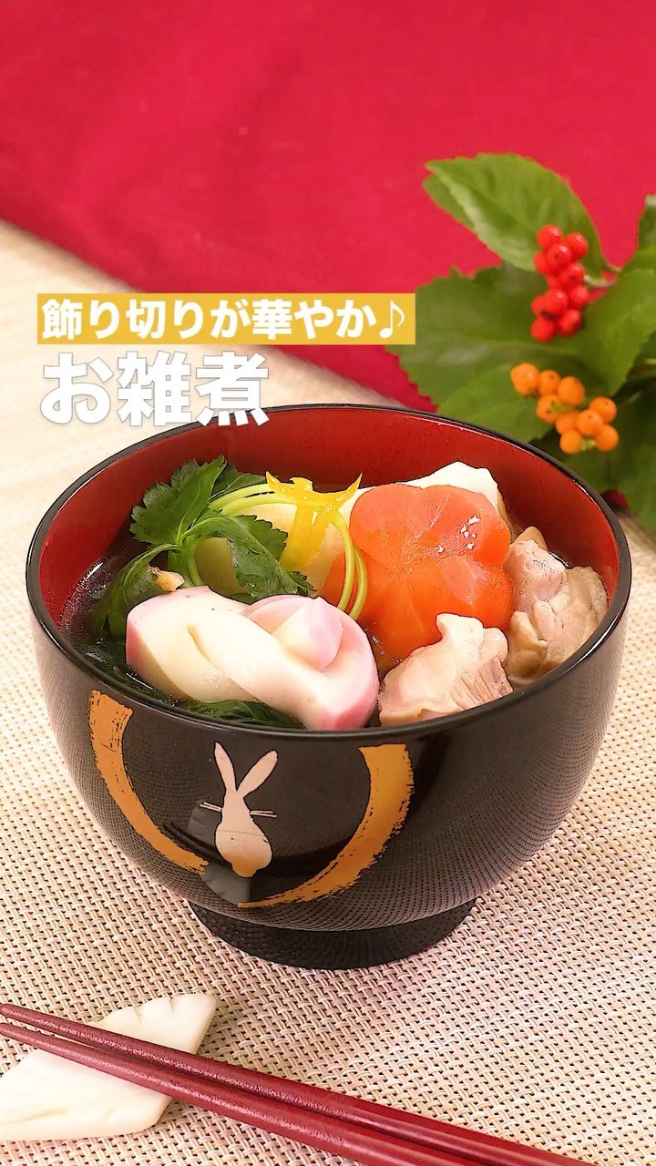 お正月には欠かせないお雑煮♪全国には地域ごとに違うお雑煮がありますが、こちらはおすまし風に味付けをした関東風レシピ。にんじん、三つ葉、ゆずが新年の食卓に彩りを添えます♪飾り切りにも挑戦して、プロのお椀のように華やかに仕上げましょう!おもちと鶏もも肉が入っているので、食べ応えもばっちりです。