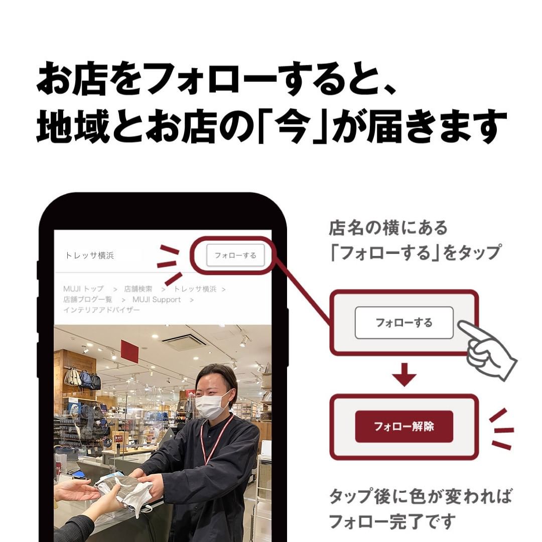 詳しい情報は、 @muji_global のハイライトアイコン、「お店のスタッフより」をタップすると、確認できます。