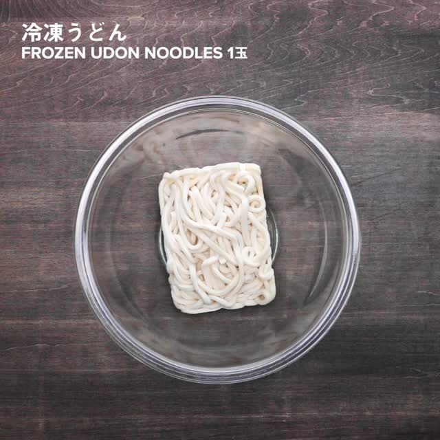 1.ボウルに冷凍うどん、ベーコンを入れ、ふんわりラップをかけて600Wの電子レンジで3分加熱する。⁣