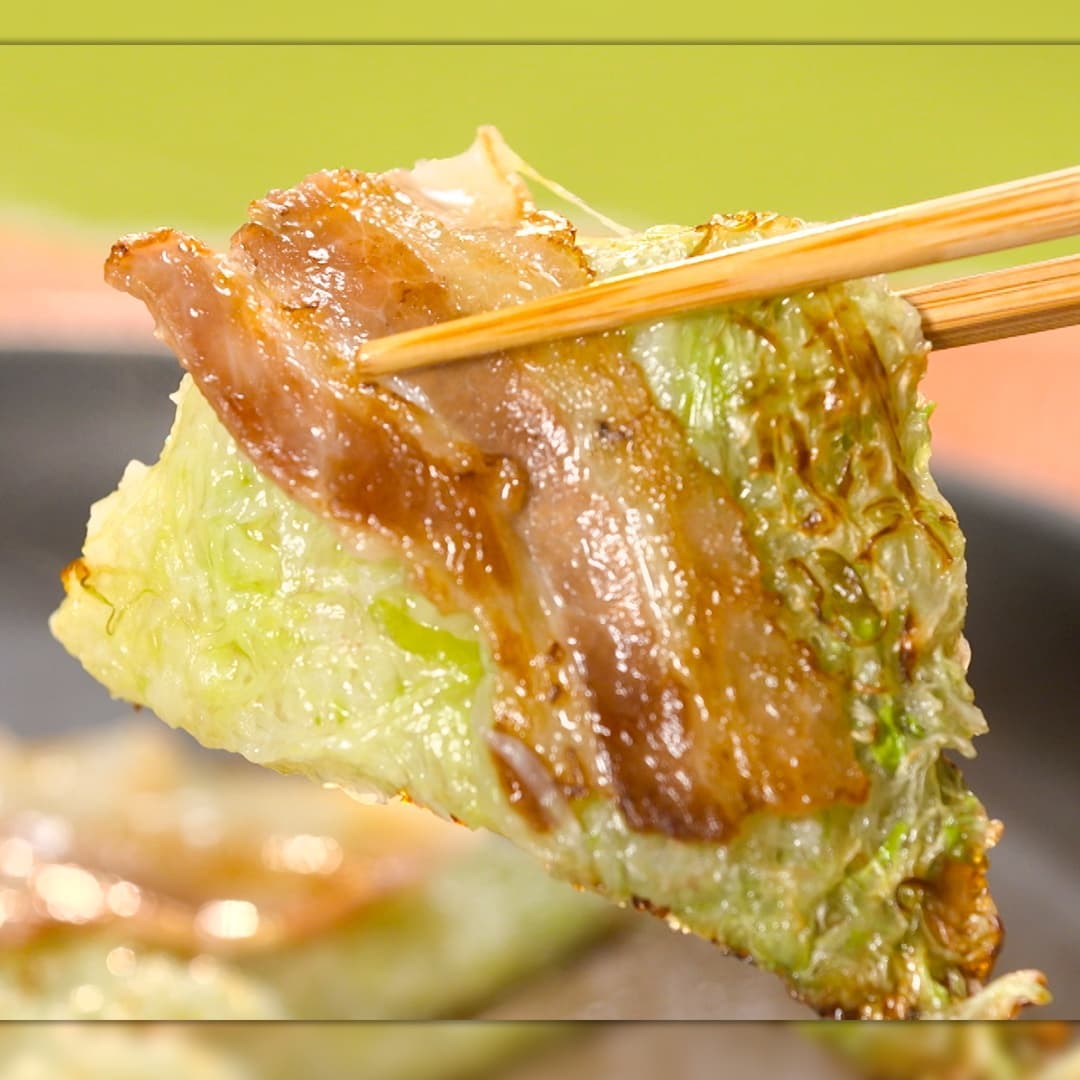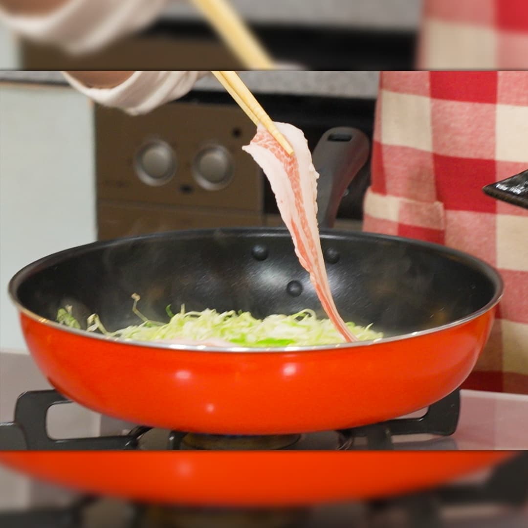 ⑤豚バラ(50g)を重ならないようにキャベツにのせ、フライ返しでひっくり返し、表