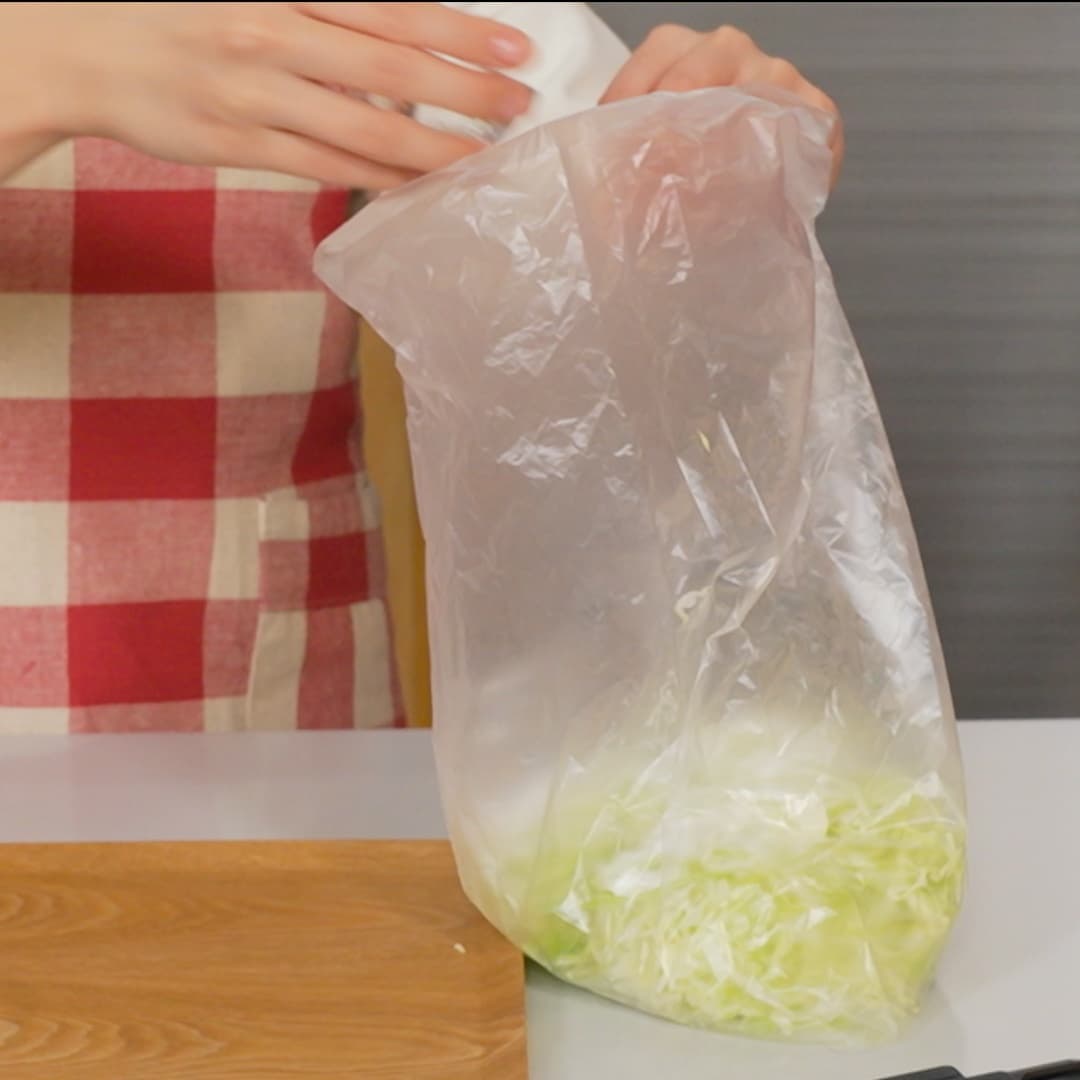 ②千切りキャベツをポリ袋に入れ、片栗粉(大さじ 1)と塩(ひとつまみ)を入れ、袋