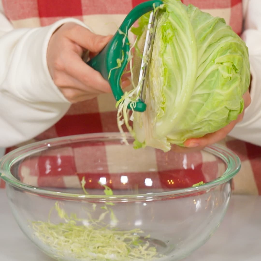 ①キャベツ(150g)を千切りにする