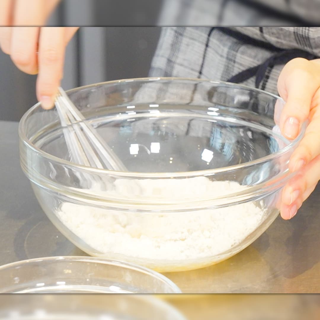①ボウルにサラダ油(50ml)ホットケーキミックス(90g)を入れ泡立て器で混ぜる