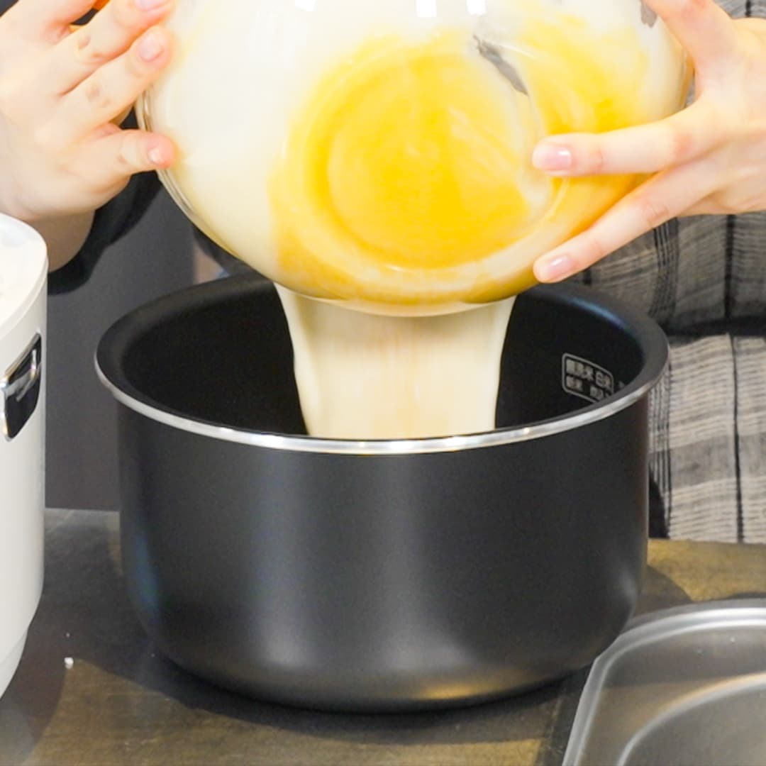 ⑥炊飯器に油を塗り⑤を流し入れ、炊飯モードで炊いたら完成!