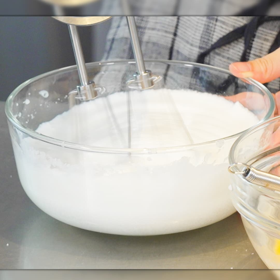 ③別の容器で卵白(4 個分)を泡立て器で混ぜてメレンゲを作る