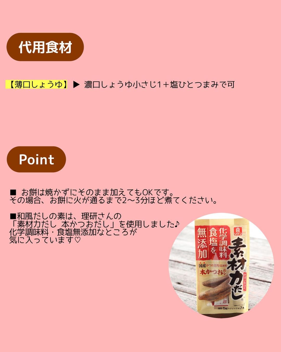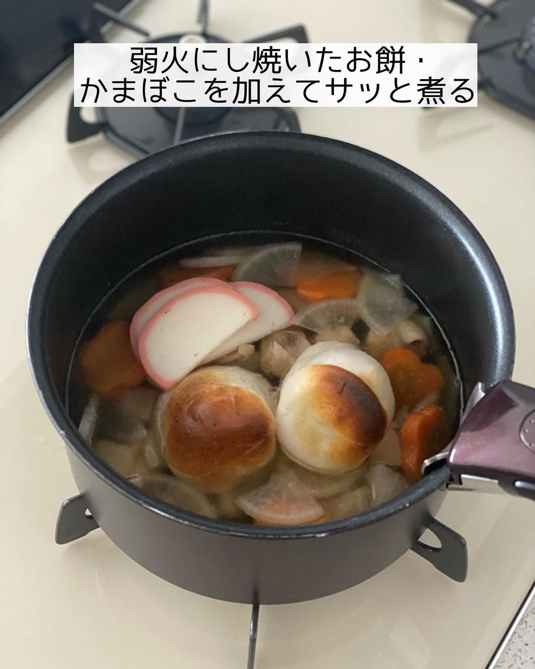 ➌蓋をあけて弱火にし、お餅・かまぼこを加えてサッと煮る。器に盛り、お好みで三つ葉を添える。