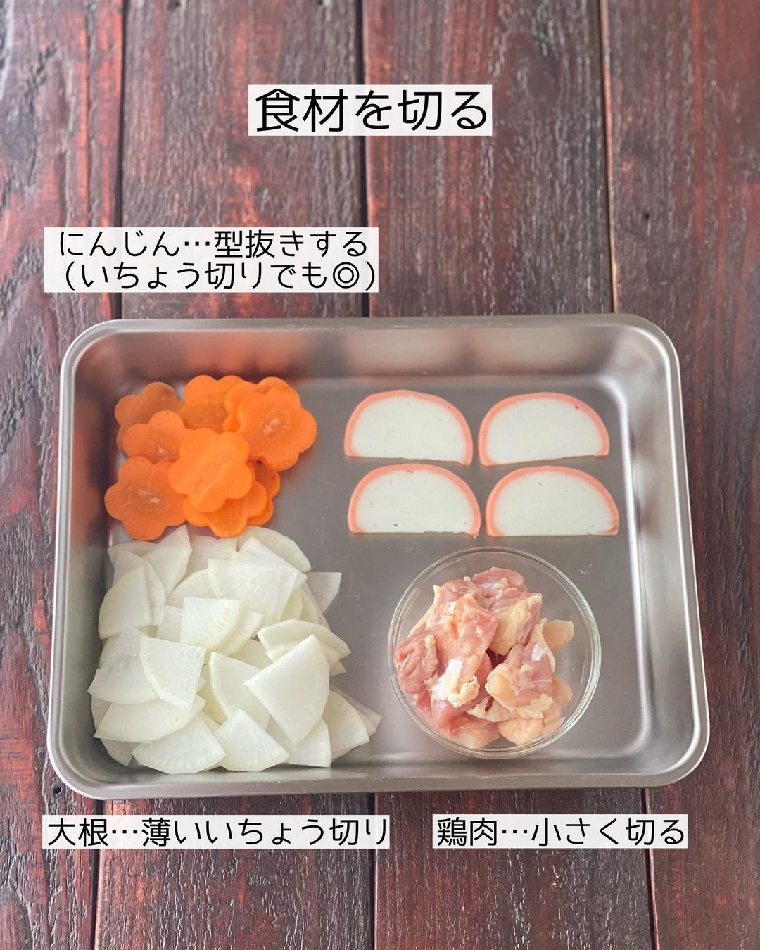 ➊鶏肉は小さめに切り、大根は薄いいちょう切りにする。にんじんは花型などに型抜きするか、薄めのいちょう切りにする。お餅は焼き色がつくまで、トースターで𝟻分ほど焼く。