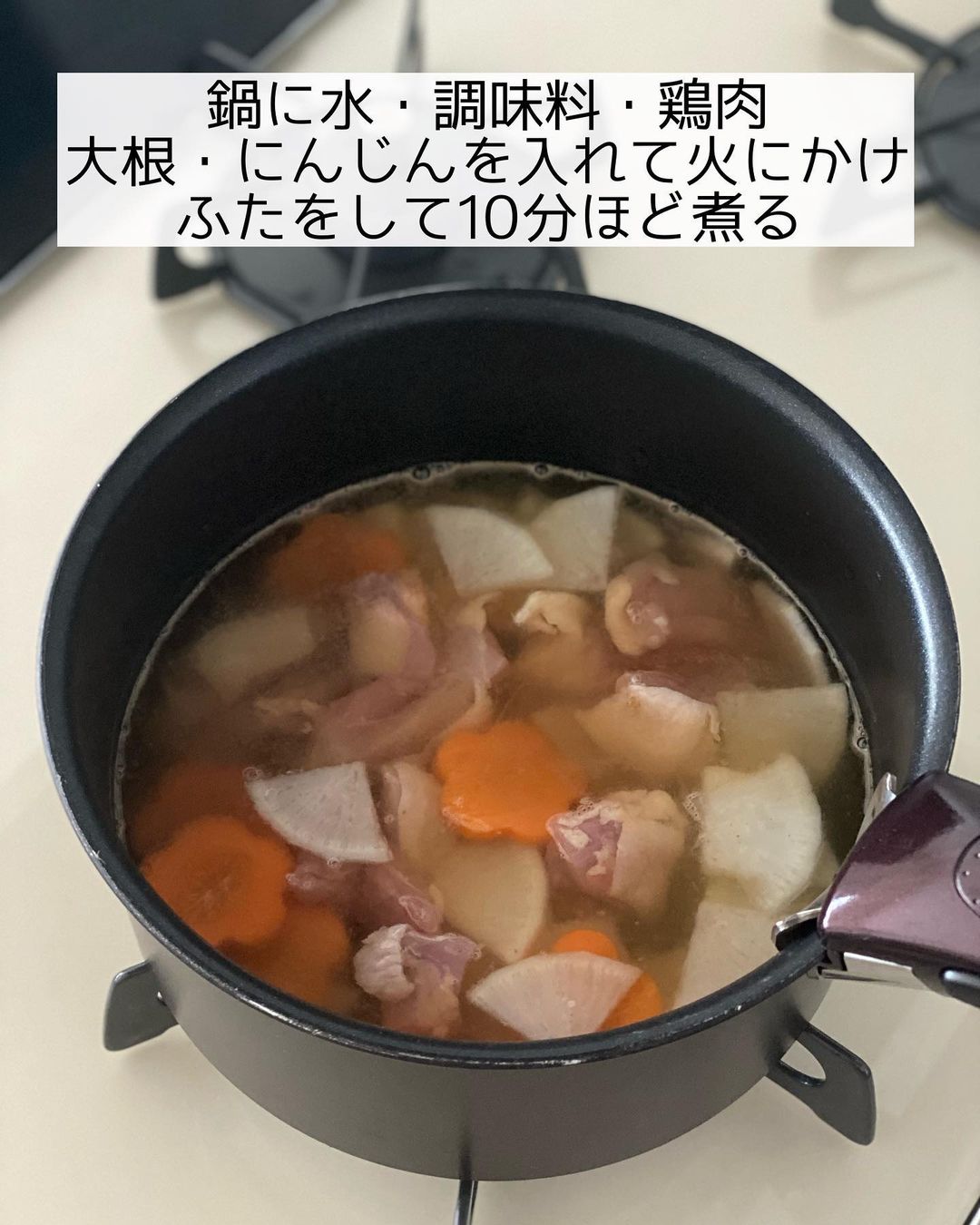 ➋鍋に〔𝙰〕・鶏肉・大根・にんじんを入れて中火にかける。沸騰したらアクをとり、蓋をして全体に火が通るまで𝟷𝟶分ほど煮る。