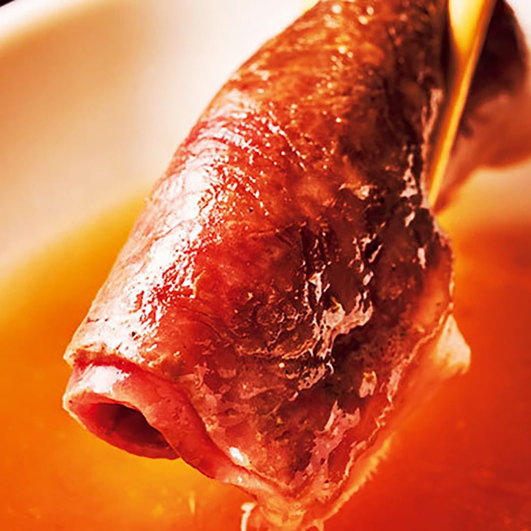 焼けたら、くるりと丸め、黄金色のつけダレにダイブ。伝統の牛骨だしをベースにしたつけダレが、重ねたロースの間に染み渡っていき、その一体感は格別!大切な人にこの美味しさをシェアしたくなる名店だ。