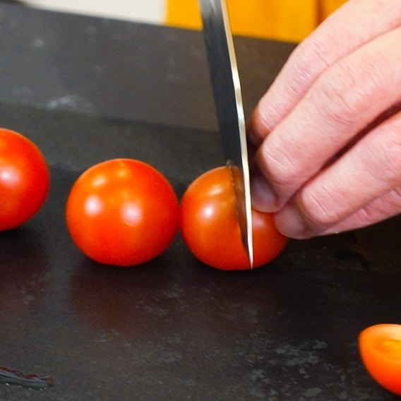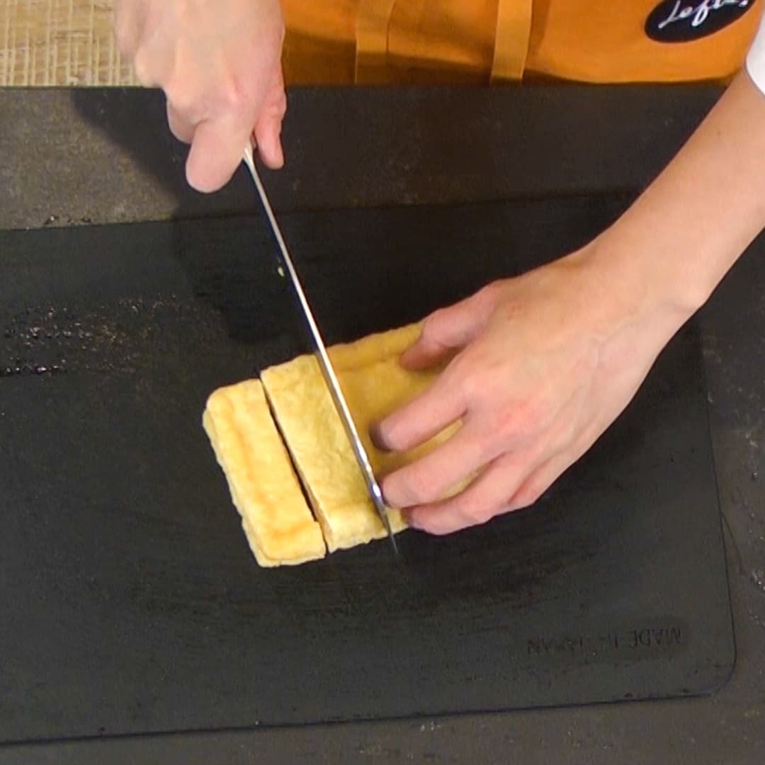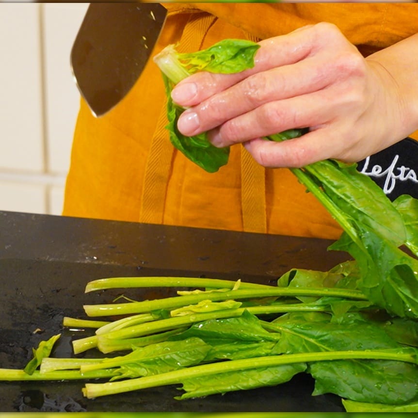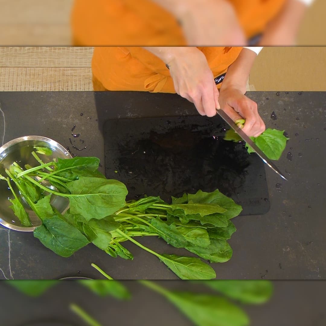 ③ヘタを取ったプチトマトを半分に、ほうれん草と油揚げを食べやすいサイズに切る