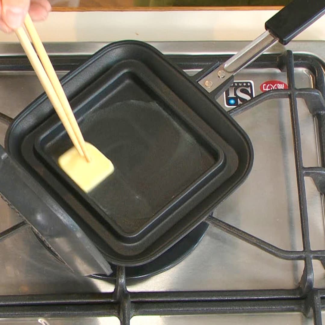 ①ホットサンドメーカーを中火にかけ、バター 10g を溶かす