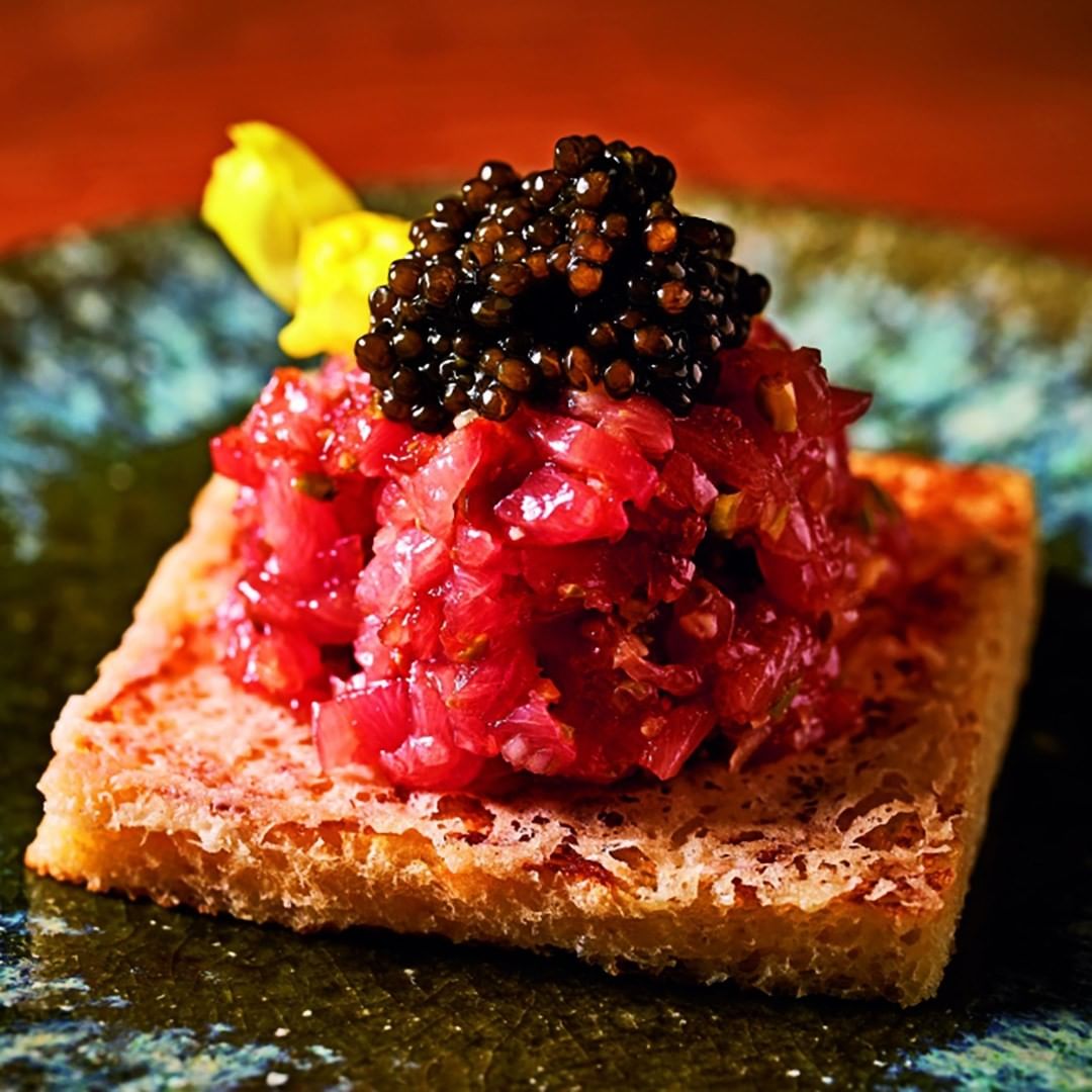 写真②▷店のスペシャリテであり、名刺代わりのひと皿ともいえる「やま幸のマグロとキャビアのタルタル」も絶品だ。 パルミジャーノでコーティングした自家製のブリオッシュの塩みと香りがまぐろを引き立てる。