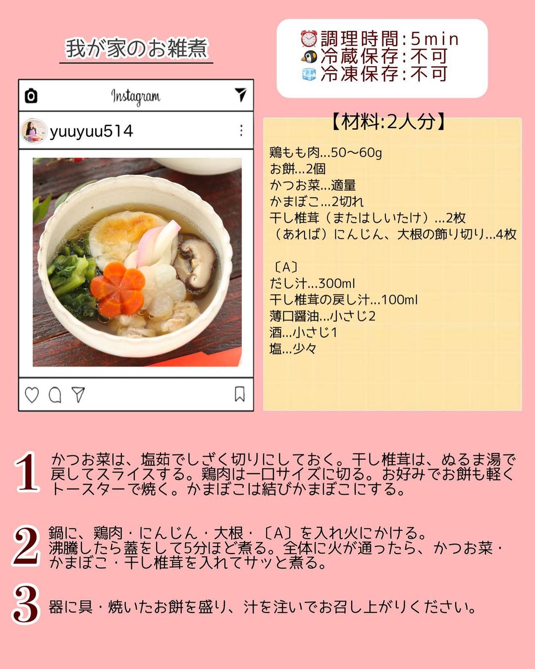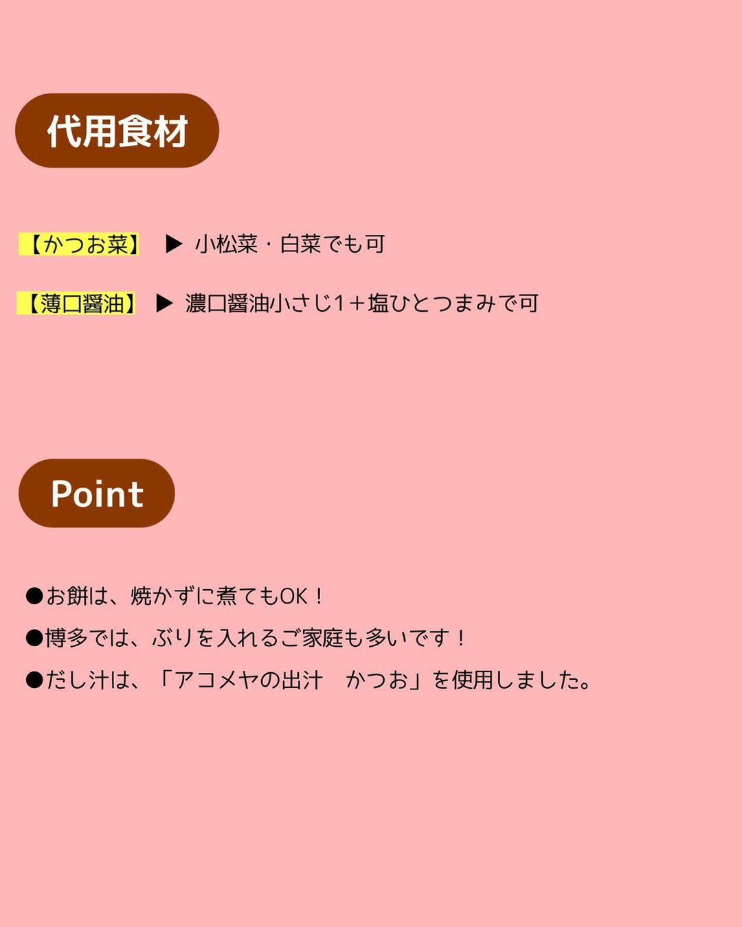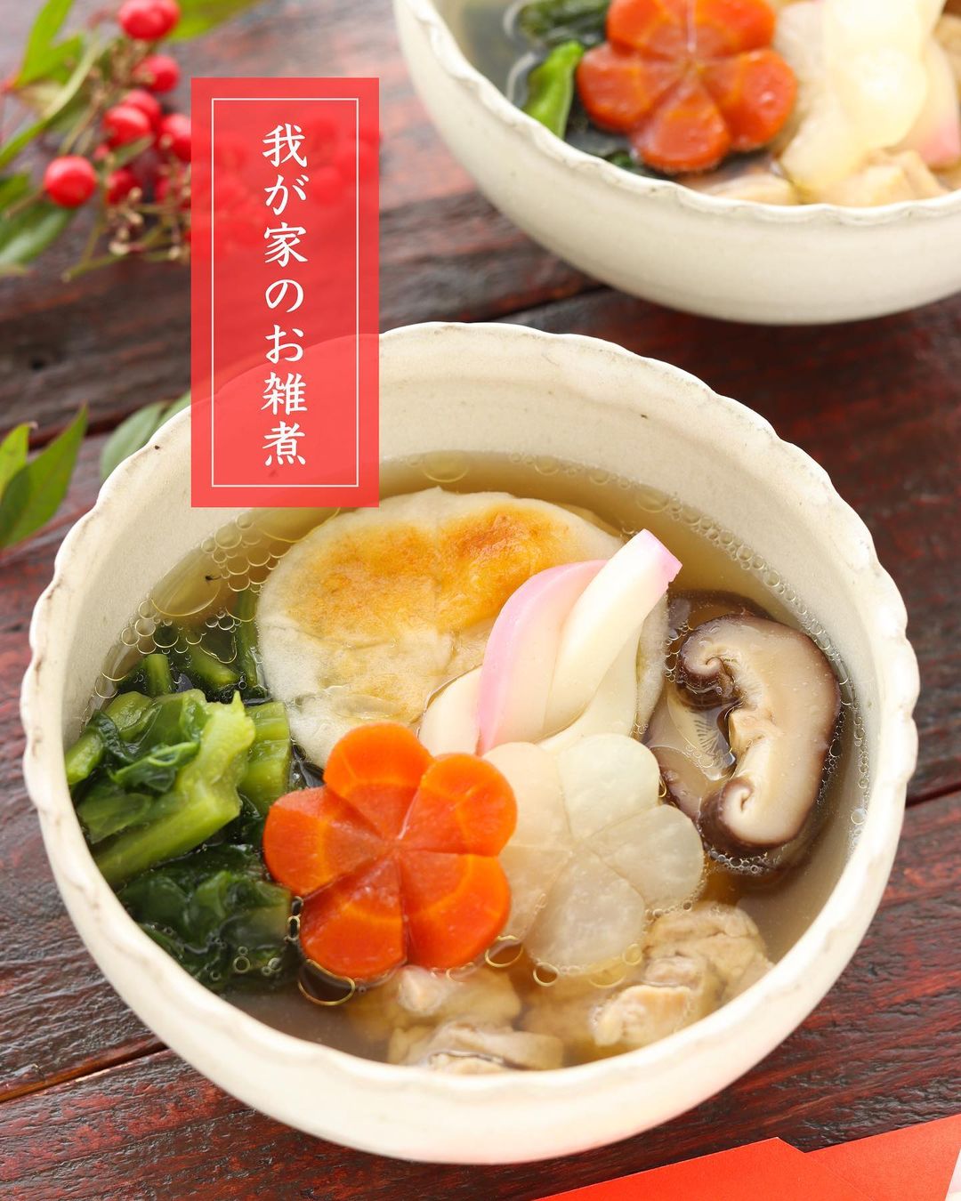 ➌器に具・焼いたお餅を盛り、汁を注いでお召し上がりください。