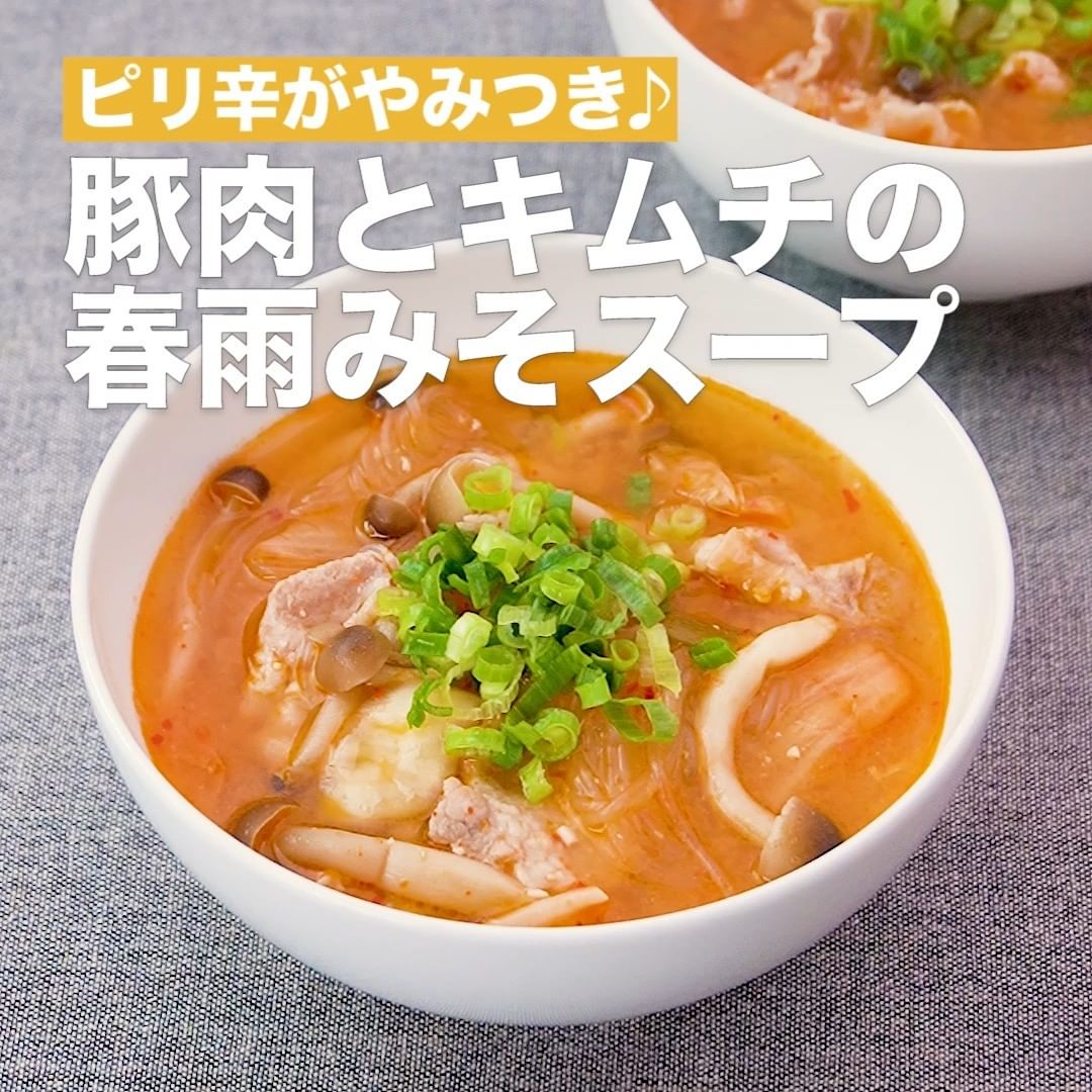 ①<ピリ辛がやみつき♪豚肉とキムチの春雨みそスープ>