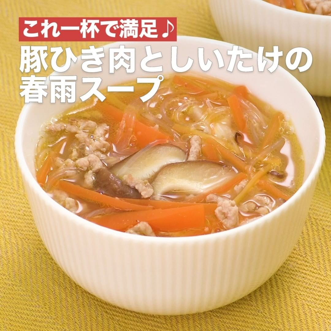 ⑦<これ一杯で満足♪豚ひき肉としいたけの春雨スープ>