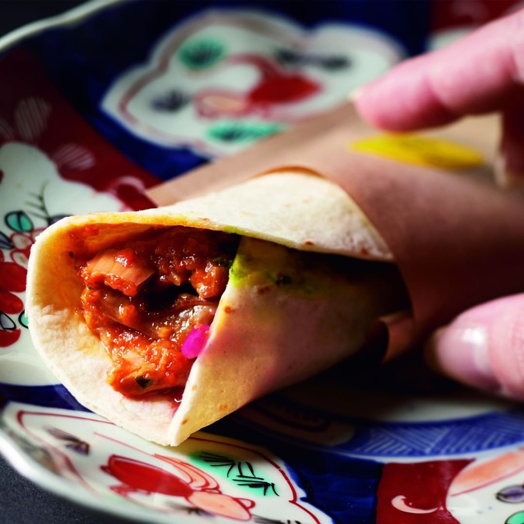 牛のギアラの煮込みを巻いたトルティーヤ。ハンズフードがあるラフさも楽しい。