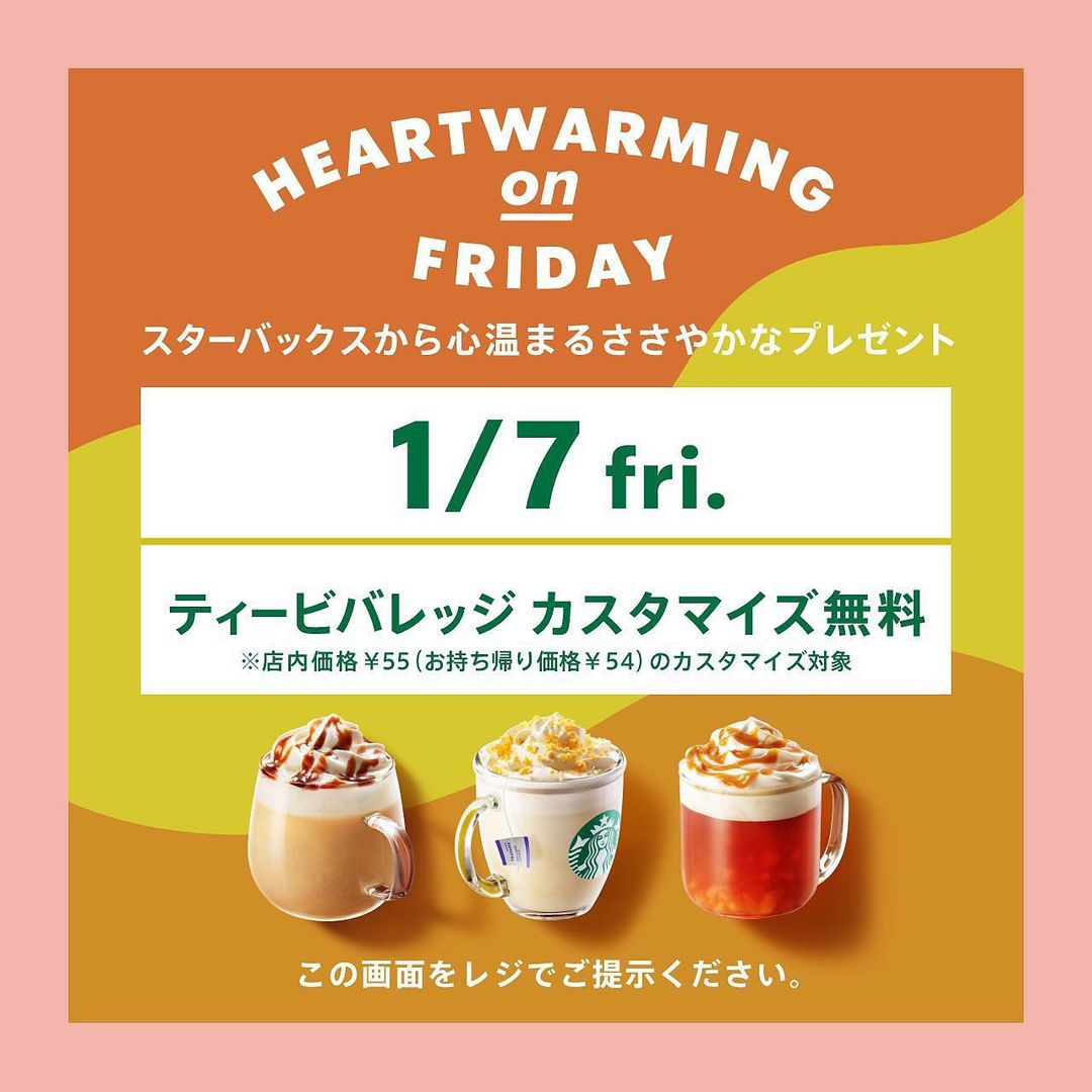 @Starbucks Starbucks: 明日1/7(金)は #HeartwarmingOnFriday ティー ビバレッジをご注文&スライドした2枚目の画像をレジで見せると55円(店内税込価格)の… 2022-01-06 🫖💙 明日1/7(金)は #HeartwarmingOnFriday 🎁 ティー ビバレッジをご注文&スライドした2枚目の画像をレジで見せると55円(店内税込価格)の有料カスタマイズを無料でお楽しみいただけます。 ✔︎おすすめカスタマイズ #イングリッシュブレックファストティーラテ + #ソイミルクに変更 ミルク変更やシロップ追加など、ちょっと贅沢気分のティーで温かい冬のひと時を過ごしませんか😋❄️ #スターバックス #ティーラテ #ティバーナ #TEAVAVA Ciao, Nihon.