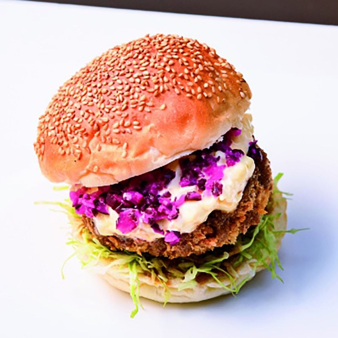 写真④ 他にはない「まぐろメンチかつバーガー」。タルタルソースとしば漬けがアクセント