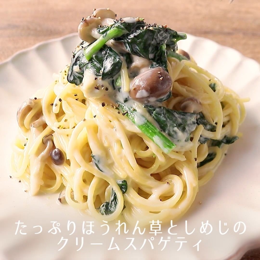 ①たっぷりほうれん草としめじのクリームスパゲティ