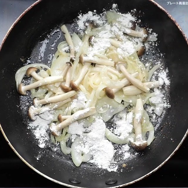 3.同じフライパンにバターを入れて中火に熱し、バターが溶けたら玉ねぎを加えて炒める。玉ねぎがしんなりしたら、しめじを加えてさらに炒める。