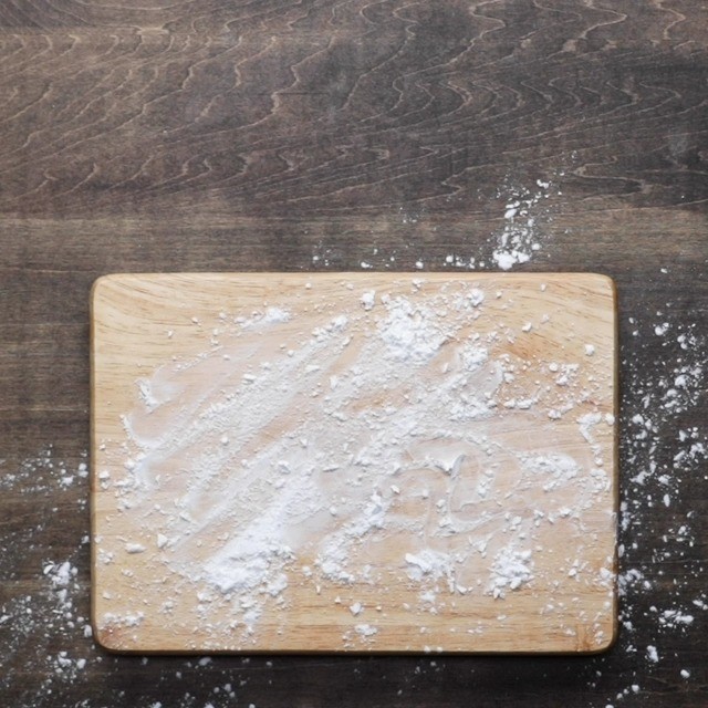 5.まな板の上に片栗粉をふり、(4)の生地を手に水をつけて取り出す。上からさらに片栗粉をまぶし、粗熱が取れたら手で広げて2等分にし、(2)を包む。