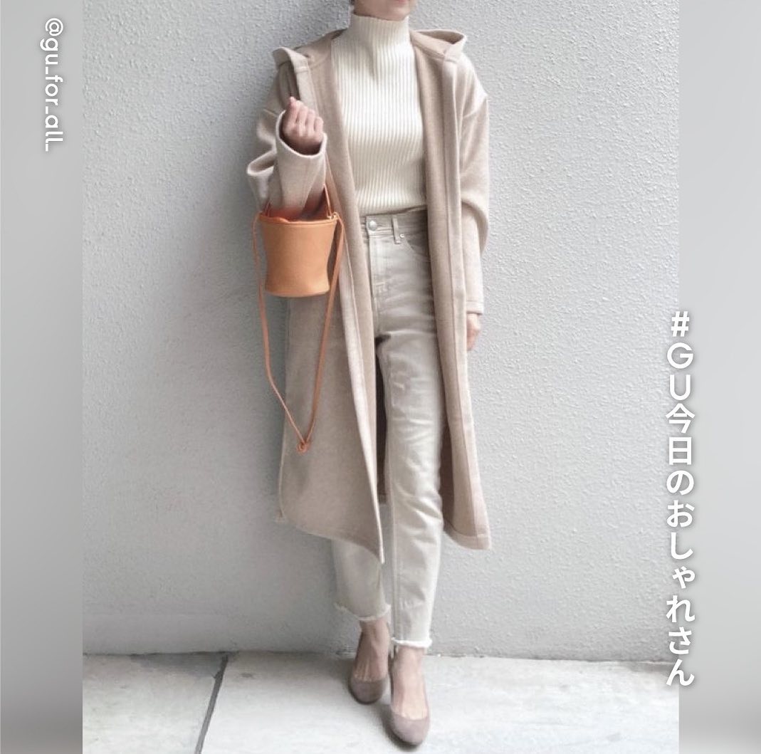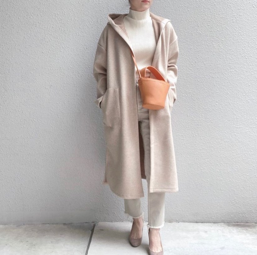 顔周りにニュアンスが出るフード付きのネックラインが特徴的なガウンコート。
