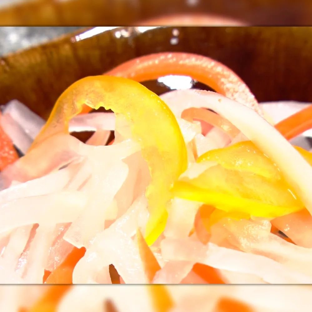 ③大根(1/4 本)にんじん(1/4 本)パプリカ(1 個)を千切りにし、砂糖(適量)を入れよく揉み込んで水抜きする
