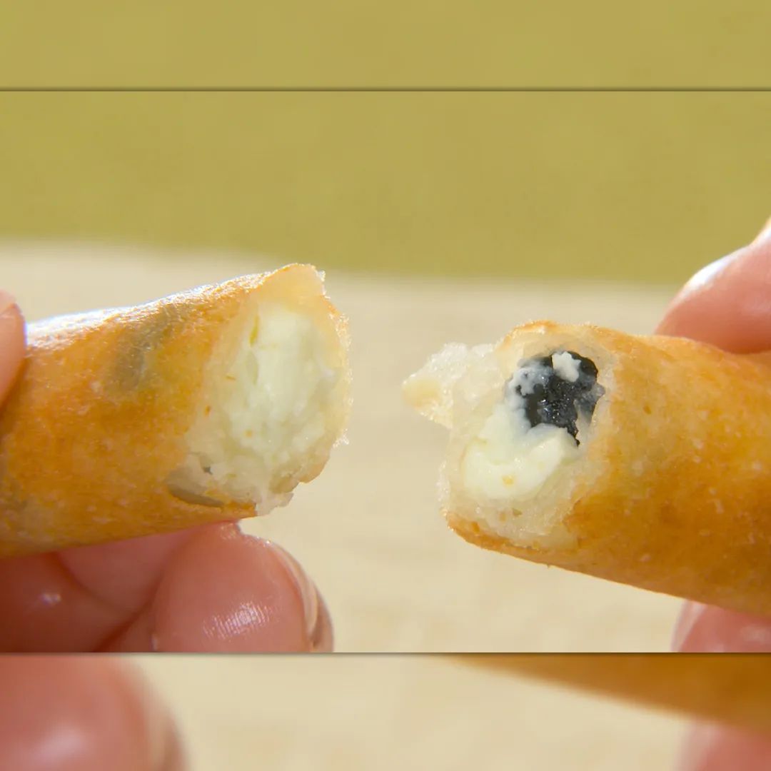 ①春巻きの皮の上に黒豆(適量)サイコロ状に切ったクリームチーズ(適量)を交互にの