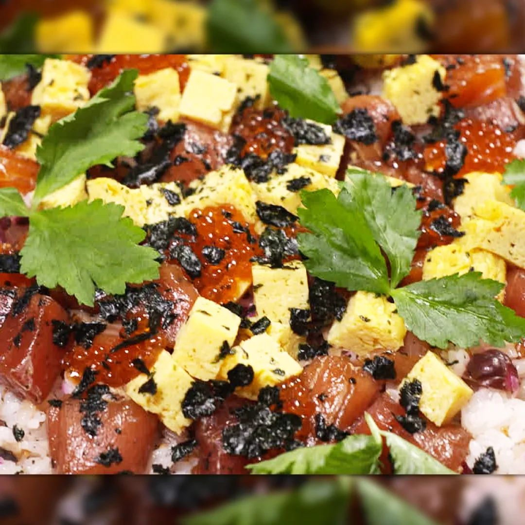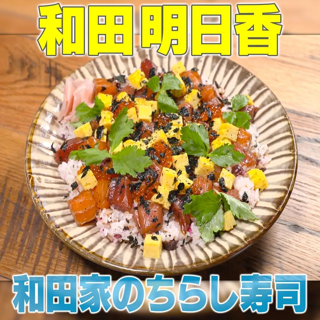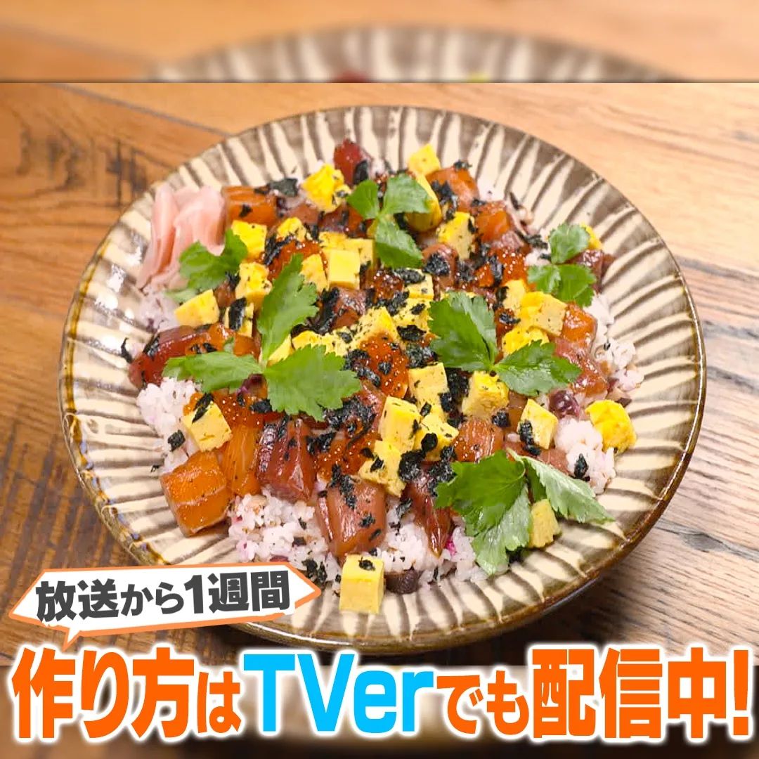 ⑦お皿に酢飯を盛り付け、漬けておいた刺身、卵焼き、いくら(お好み)海苔(適量)三つ葉(適量)ガリ(お好み)を盛り付けたら完成!