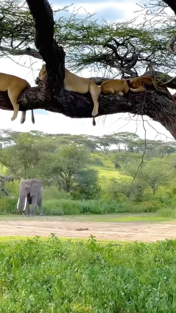 Resting lions and a wandering elephant spotted at the Serengeti in Tanzania 🦁🐘