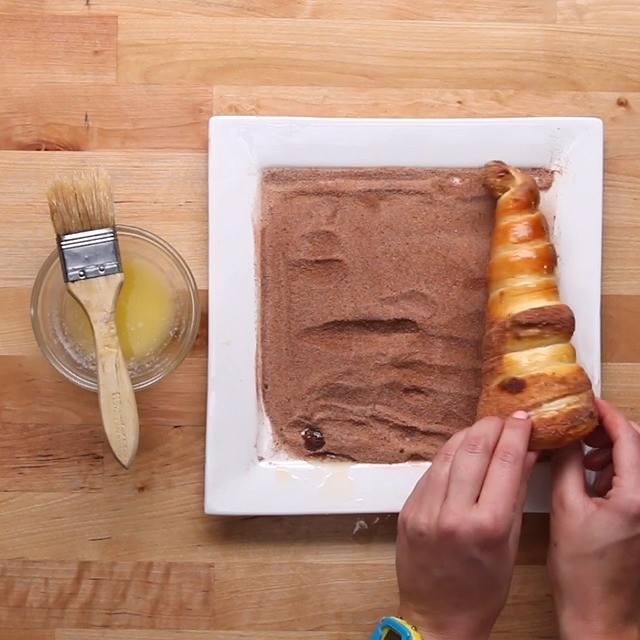 12.マフィン型に生地を巻きつけたコーンを尖った部分を上にして並べる。溶き卵を塗る。