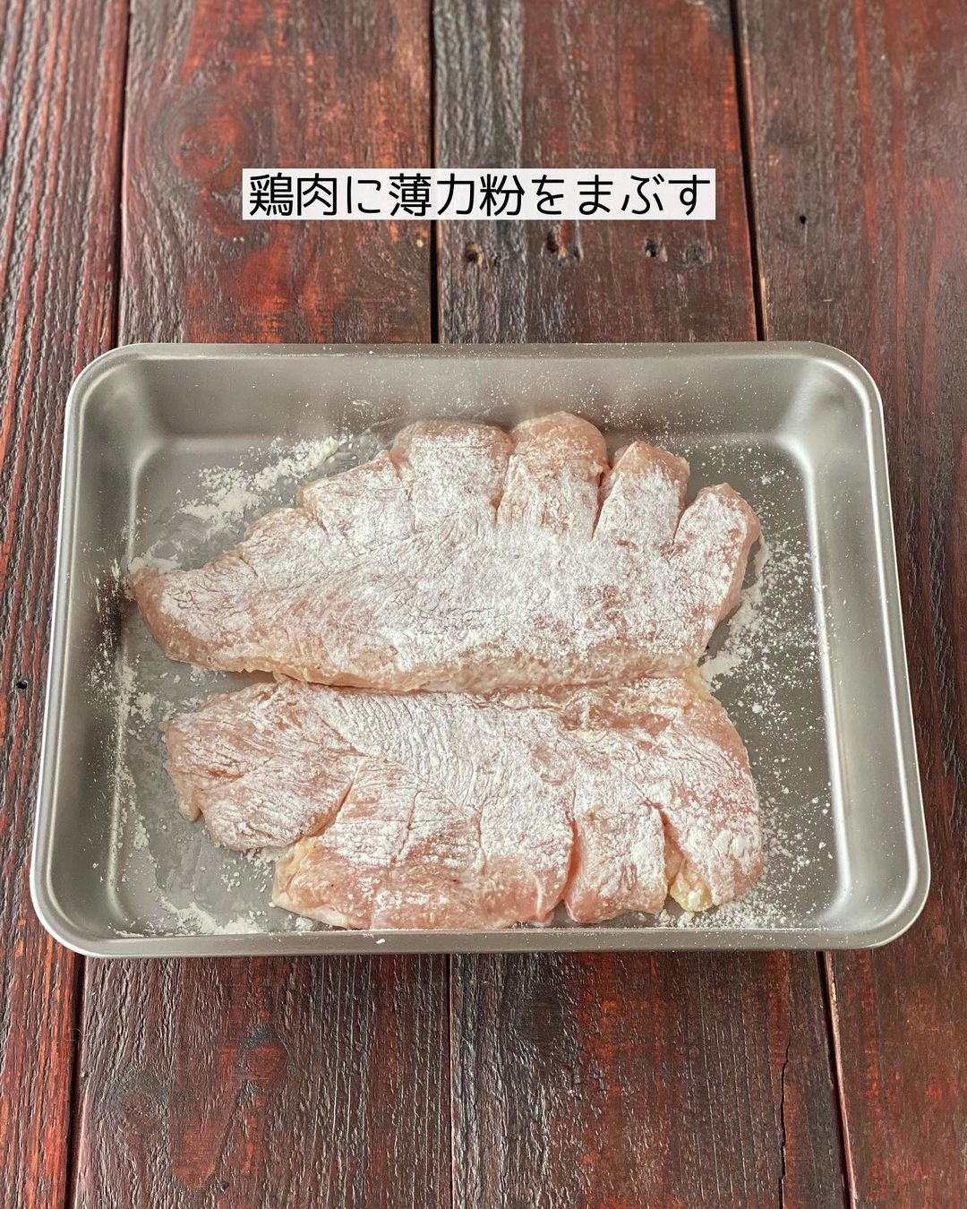 ➊鶏肉は皮目からフォークで数カ所刺し、厚さを半分に切る。ラップをかぶせて麺棒などで叩き、𝟹𝚌𝚖間隔で切り込みを入れる(キッチンバサミを使うとラクチン)。〔𝙰〕をふって𝟷𝟶分おき、両面に薄力粉をまぶす。