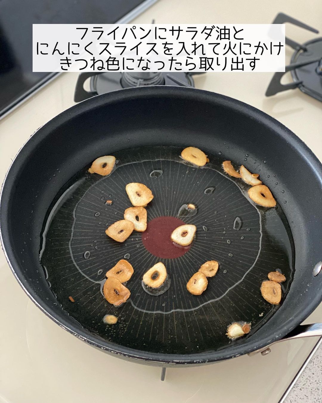 ➋フライパンにサラダ油とにんにくを入れて中火にかける。にんにくが色づいたら取り出し、1を並べる(皮があるものは皮目を下に)。𝟹〜𝟺分焼き、焼き色がついたら裏返し、蓋をして弱火で𝟹分ほど蒸し焼きにする。