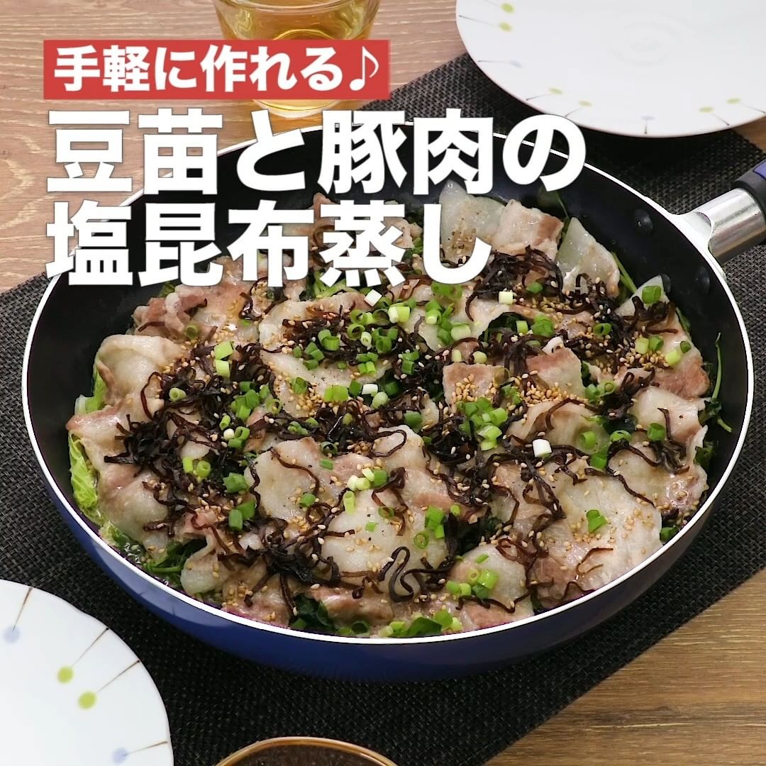 ①<手軽に作れる♪豆苗と豚肉の塩昆布蒸し>