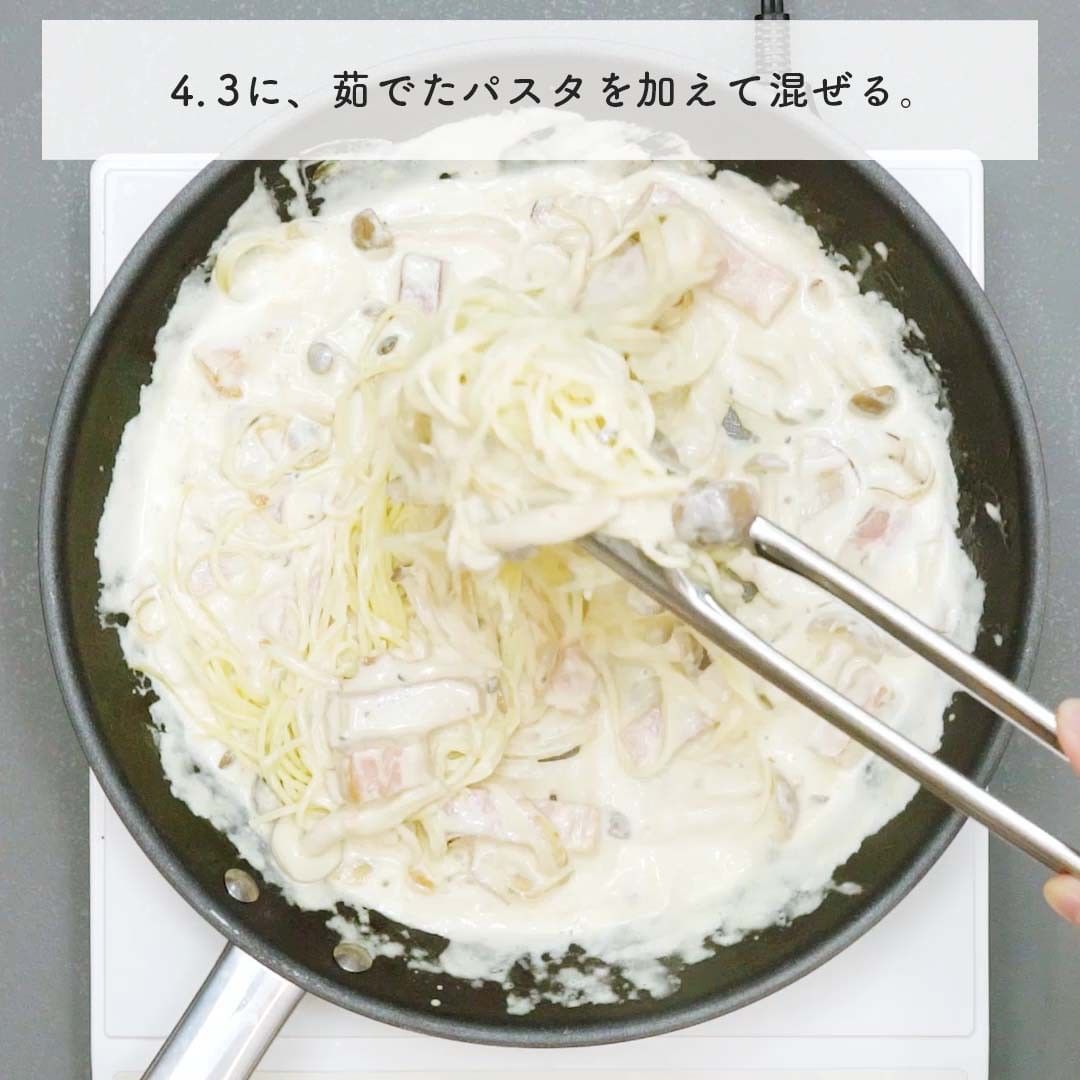 3. 生クリーム、チーズソース、塩、コショウを加え混ぜ、茹でたパスタを加えて混ぜる。
