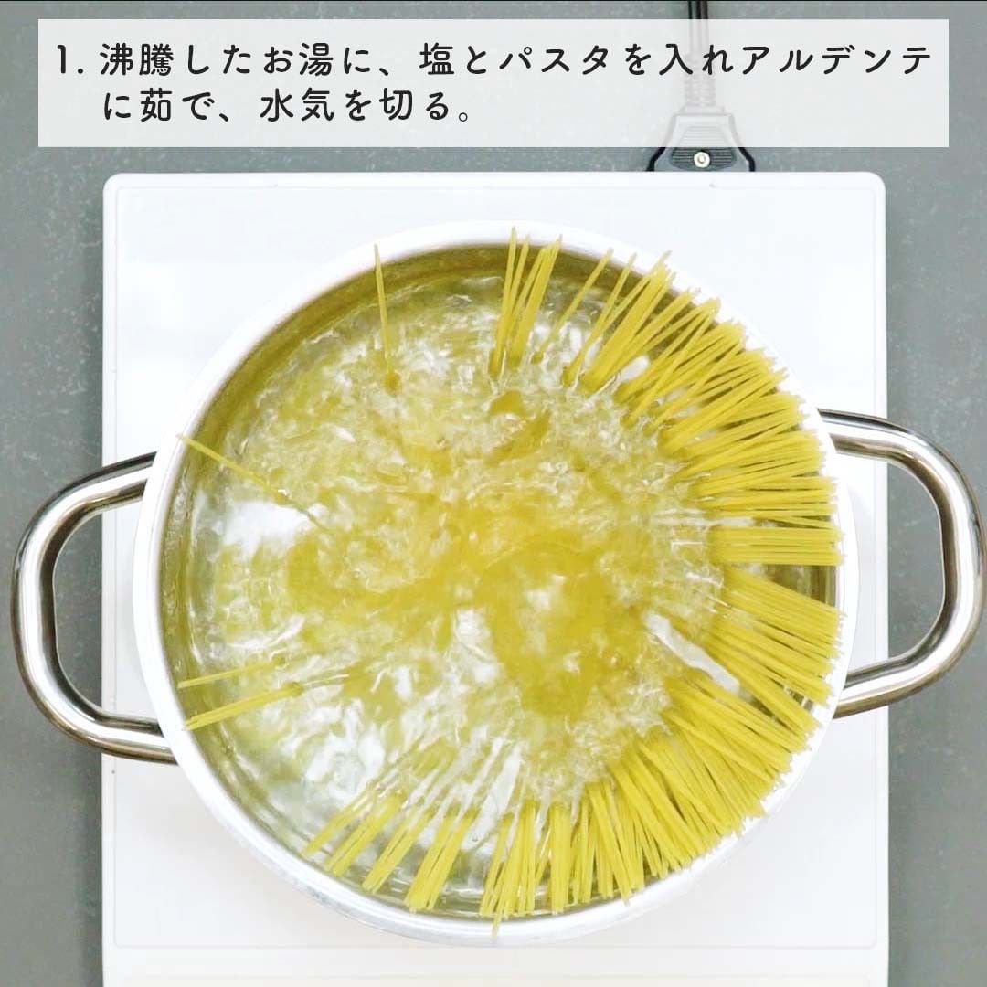 1. パスタ、塩を沸騰したお湯に入れアルデンテに茹でる。