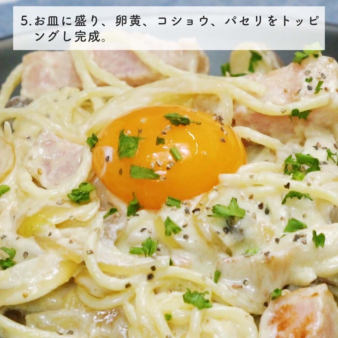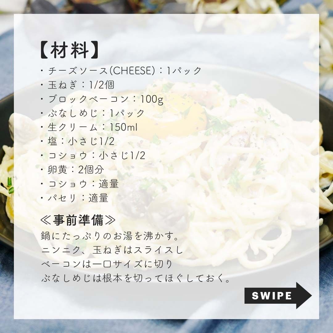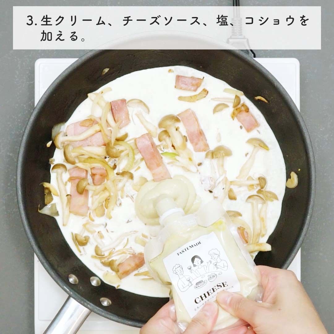 生クリームとテイストメイドオリジナルのチーズソースで簡単に味が決まる濃厚クリームパスタです🧀