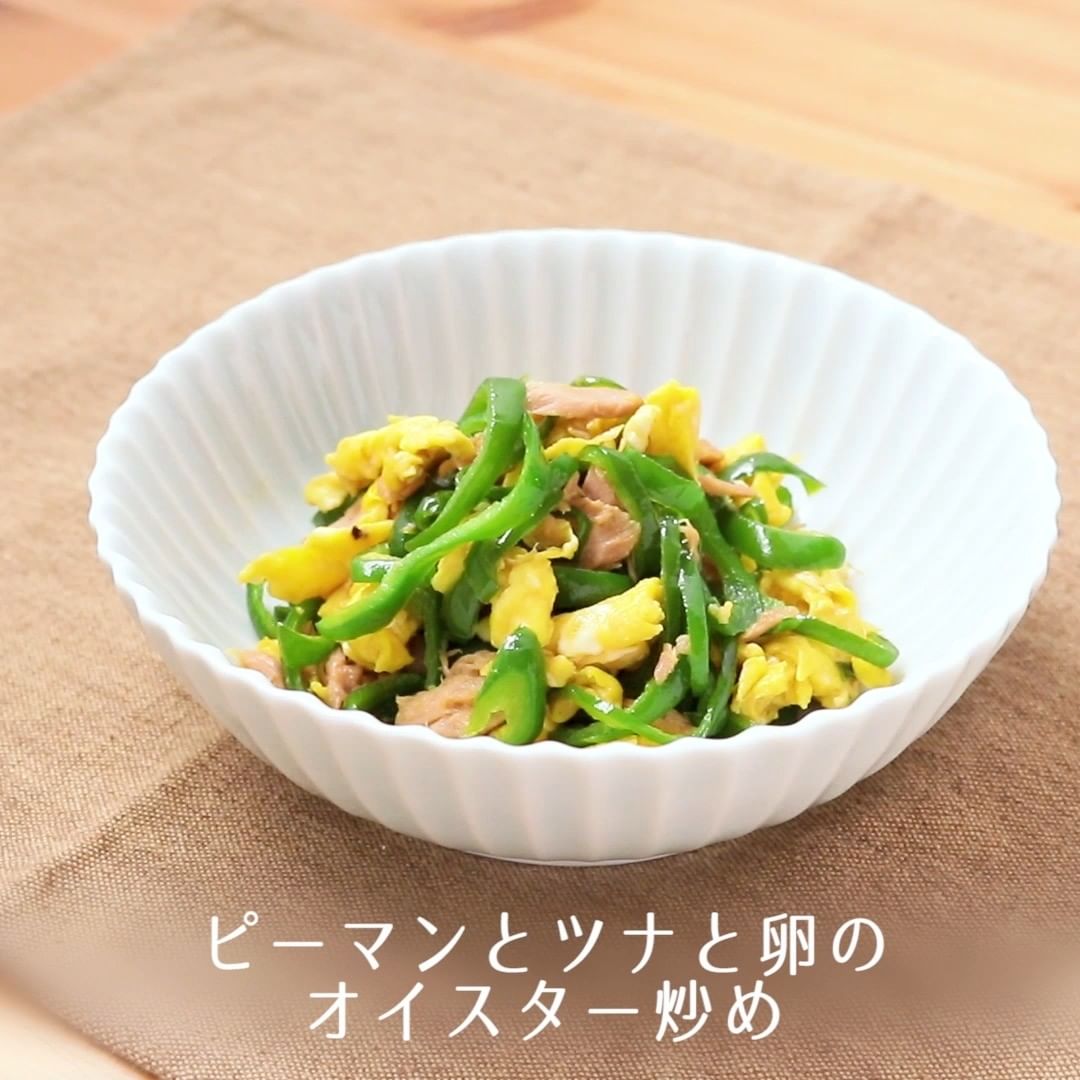 ①ピーマンとツナと卵のオイスター炒め