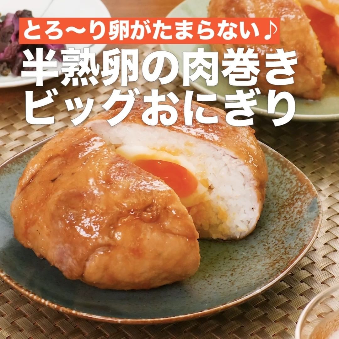 ①<とろ〜り卵がたまらない♪半熟卵の肉巻きビッグおにぎり>