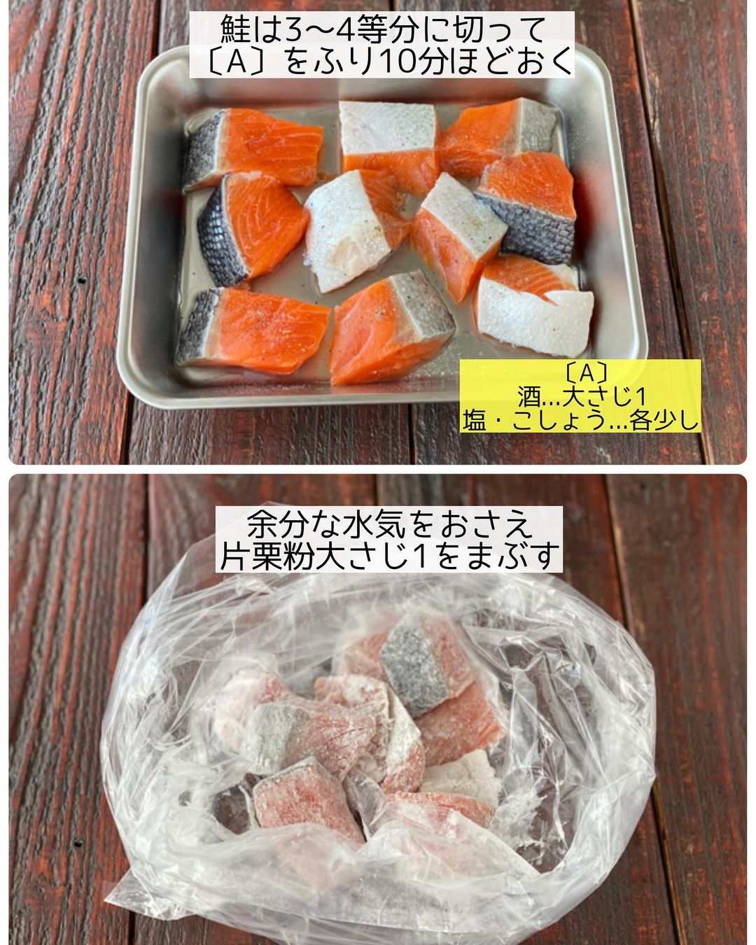 ➊生鮭は3〜4等分に切って〔A〕をふり10分ほどおく。ペーパータオルで余分な水気を抑え、片栗粉をまぶす。キャベツは手でちぎる。
