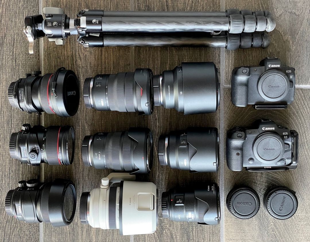 “What’s in my bag? Well, I break down my gear this way; two camera bodies, the Canon EOS R and EOS R5, three prime lenses, the EF 35mm f/1.4 II USM, RF50mm F1.2 L USM, and RF85mm F1.2 L USM. Then I have three zoom workhorse lenses, the RF15-35mm F2.8L IS USM, RF24-70mm F2.8L IS USM, and RF70-200mm F2.8L IS USM. And lastly, I have my three Tilt-Shift Lenses, TS-E 17mm f/4L, TS-E 24mm f/3.5L II, and TS-E 90mm f/2.8L Macro.
