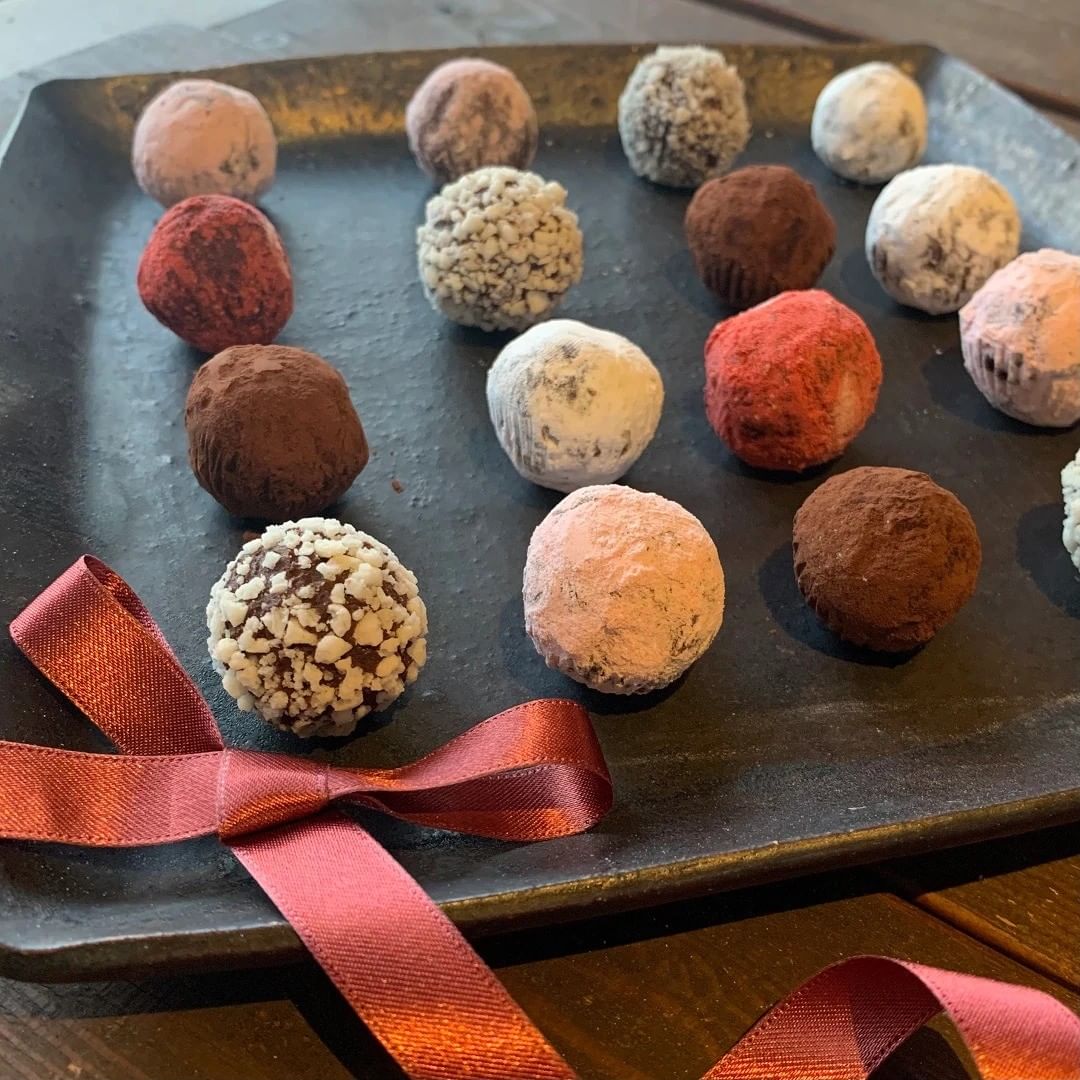 溶かしたチョコを冷やして丸めたら、5種類のトッピングで周りをコロコロコーティング。