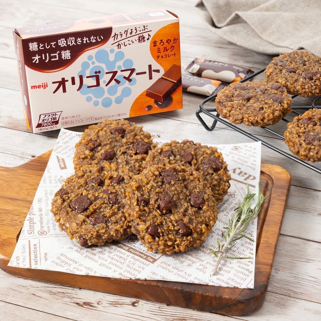 ジップ付保存袋で簡単!ごろっとチョコのオートミールクッキーのご紹介です。「オリゴスマートミルクチョコレート」にオートミールとバナナを合わせ、体にも優しいクッキーに仕上げました。「オリゴスマートミルクチョコレート」のまろやかな甘みで、しっかりおいしく満足感のある味わいになりますよ。材料4つですぐ完成するので、おやつにはもちろん軽食にもぴったり!ぜひ一度お試しくださいね。