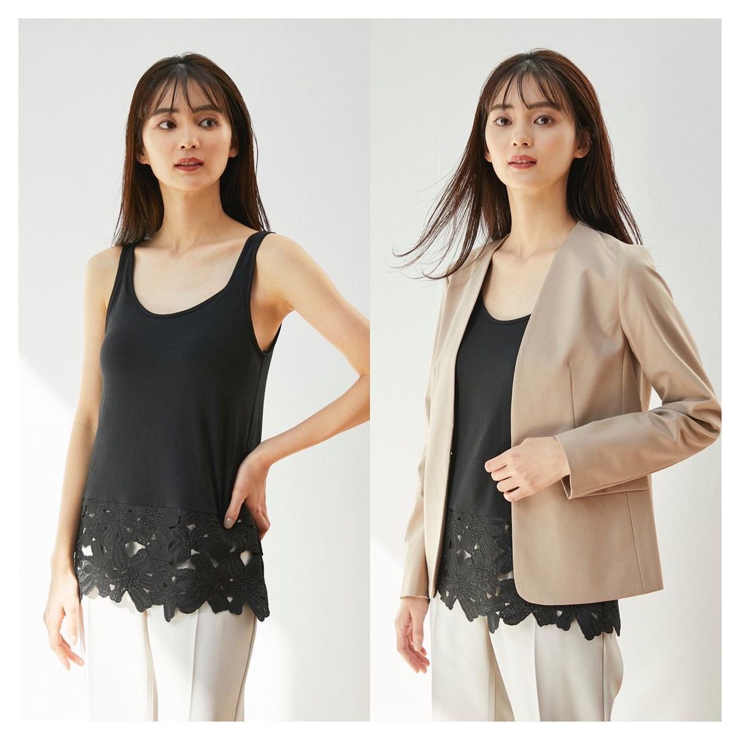 ボートネック、裾レースのぺプラムなど羽織コーデにポイントを。