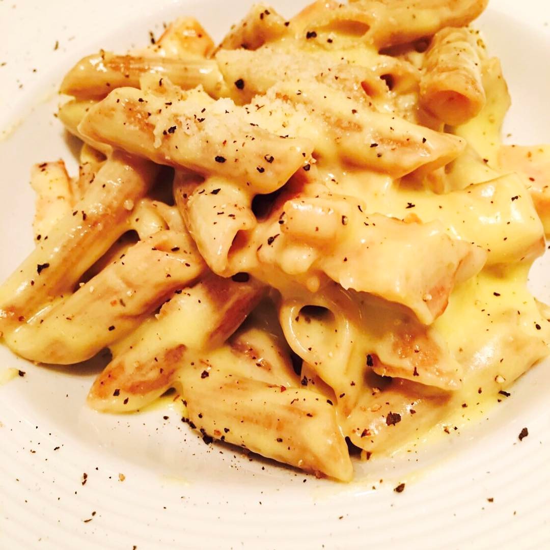 『GREEN BROTHERS 大手町店』のディナーメニュー「スペルト小麦のカルボナーラ ペンネ」。しっかりとした歯ごたえがやみつきになる。カスタムサラダと一緒にいただきたい!